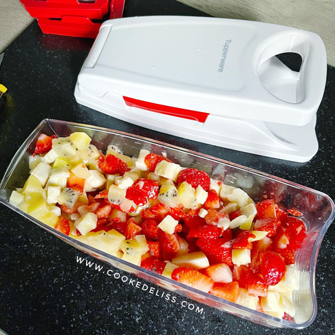 1/ Epépinez les tomates et concombre. À l'aide du couteau à tomates ou du Superdicer Tupperware coupez les tomates et les concombres en morceaux.